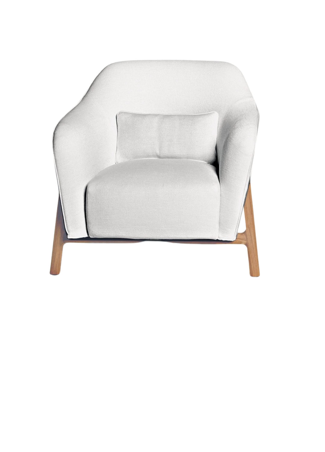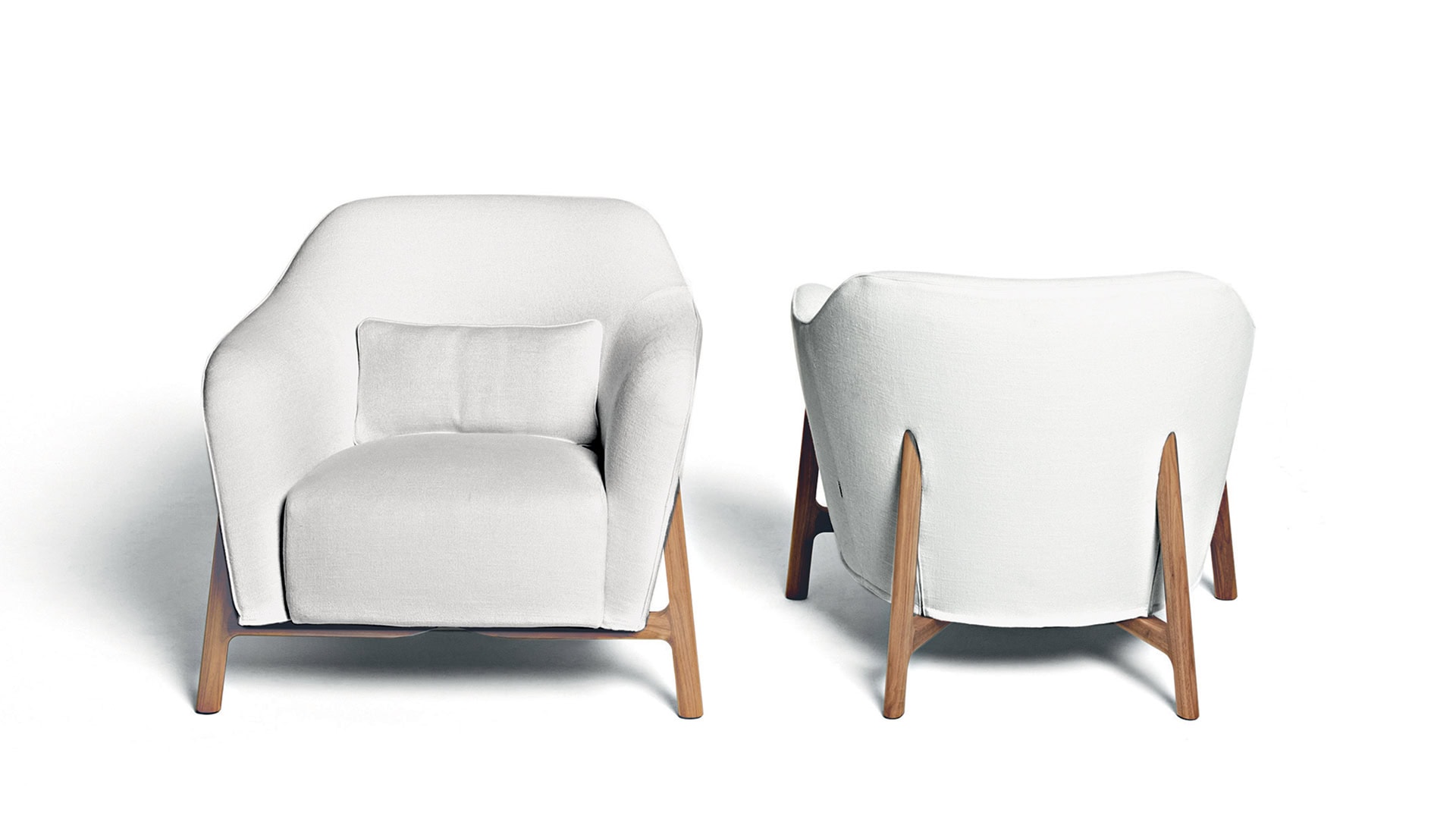 A sculptural armchair defined by its structural clarity, where inclined wooden legs and soft volumes create a balanced composition of comfort and form.
